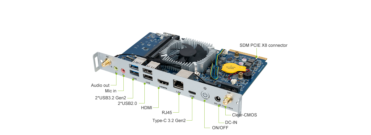 具备强大的网络通讯能力和丰富的接口,内含2个Type-C接口及8个USB接口,1个2.5 GbE RJ45网络接口,传输速率为2.5千兆比特每秒,比传统的1千兆比特每秒(1GbE)要快2.5倍,可以用于连接各种网络设备,例如交换机、路由器、服务器等,还可用于连接智能家居设备以及自动化设备。支持Windows 11/ Linux Ubuntu,支持1 x E-Key M.2 (2230) for Wi-Fi/BT,Wi-Fi 5,Wi-Fi 6 (CNVi)