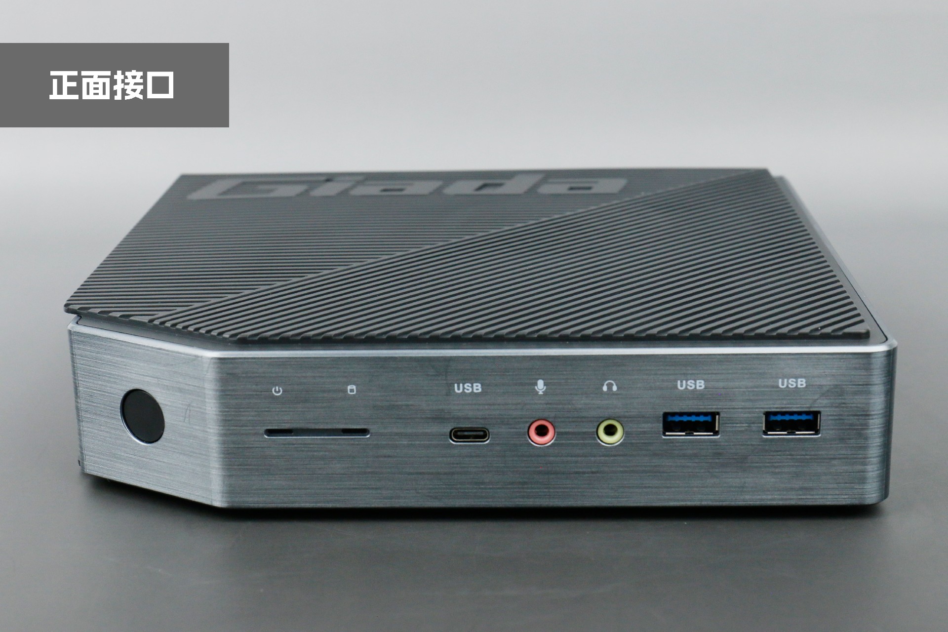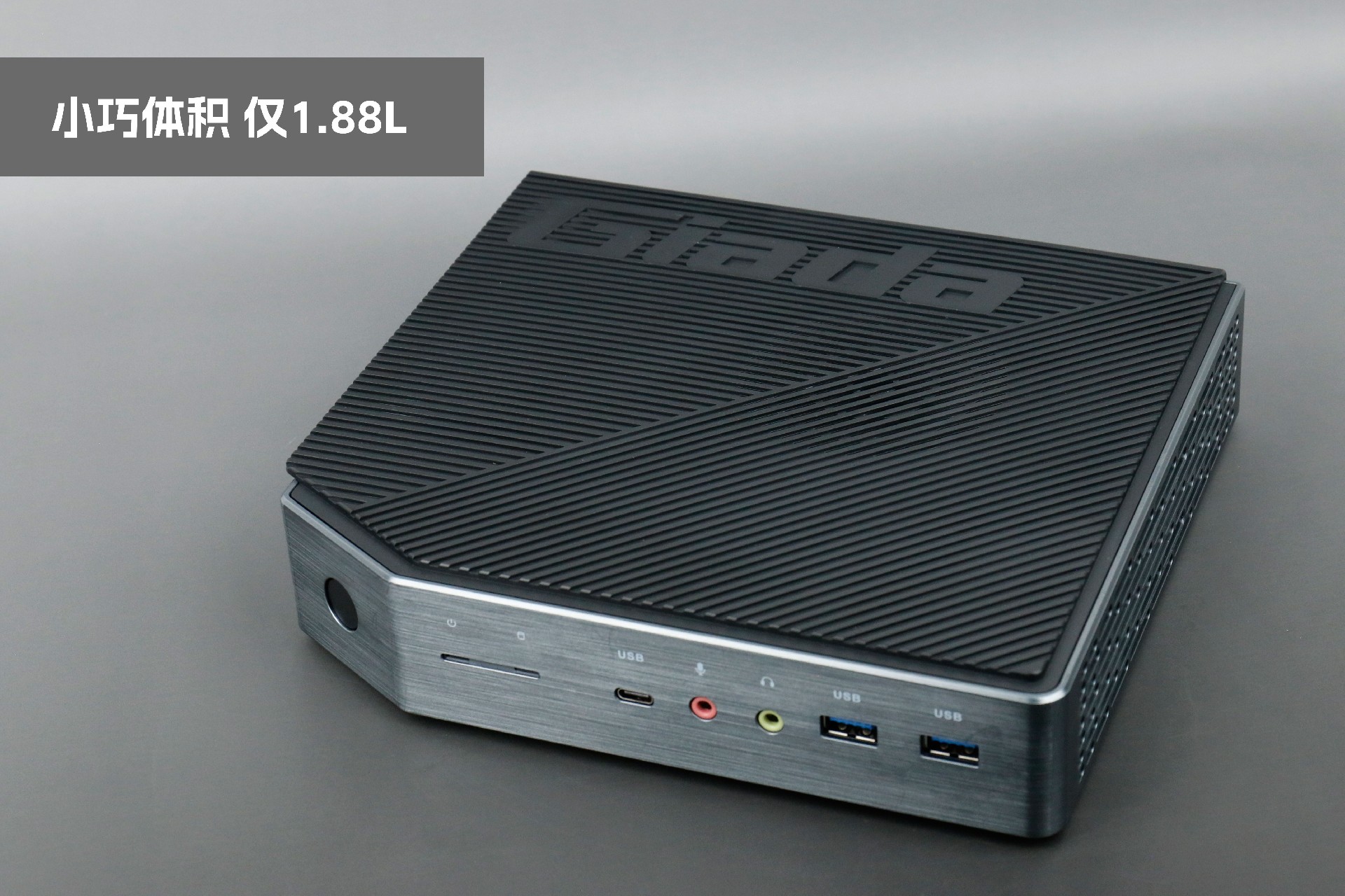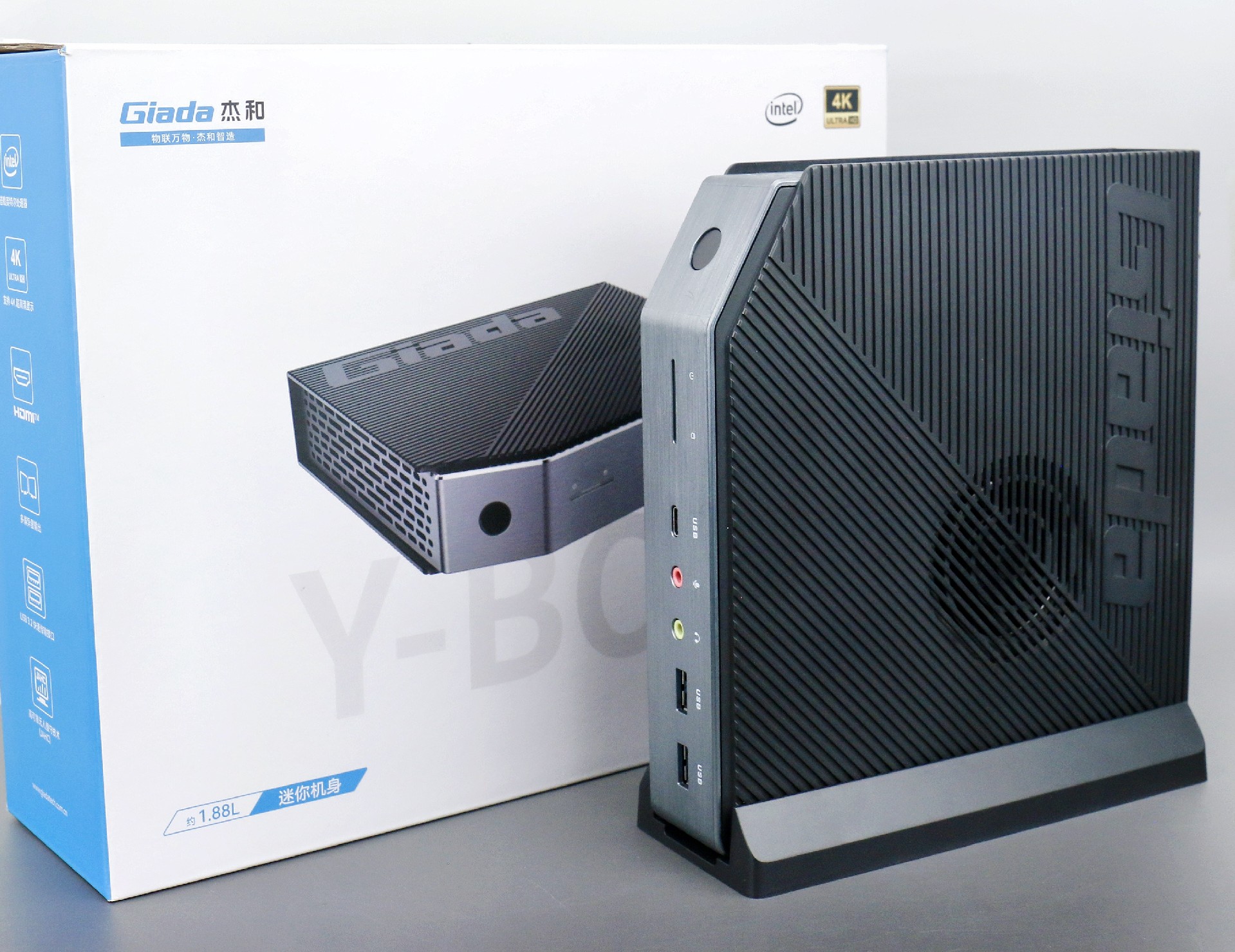 打开k8凯发桌面云终端Y-BOX P3,你会发现它的结构并不是常见的四方体设计,而是在转角处好似被切割开一个角,切割出来的面积为指纹识别开机键。它的外观为优雅的银灰配色,机身正面厚重感十足,顶部依然沿用黑色哑光栅格并延伸至整机背面,磨砂塑胶材质壳,印刻k8凯发Giada品牌名;其他三面则为银灰色,两侧是蜂窝式通风口设计。