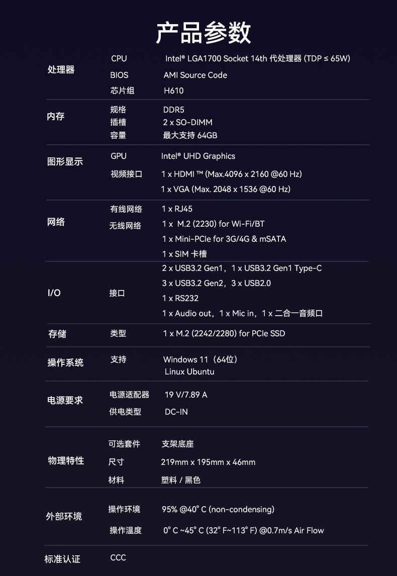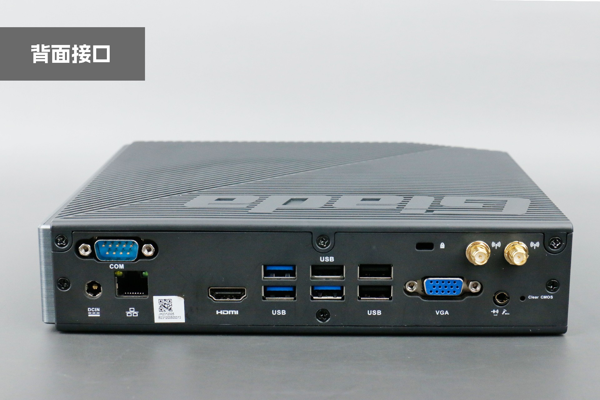 背面为1个DC-IN圆形电源接口,1个千兆网口RJ45,一个COM口,1个HDMI和1个VGA视频接口,3个USB3.2 Gen2和3 x USB2.0接口,以及1个二合一音频口及WiFi连接线,兼容全部主流外设,满足更多应用拓展。