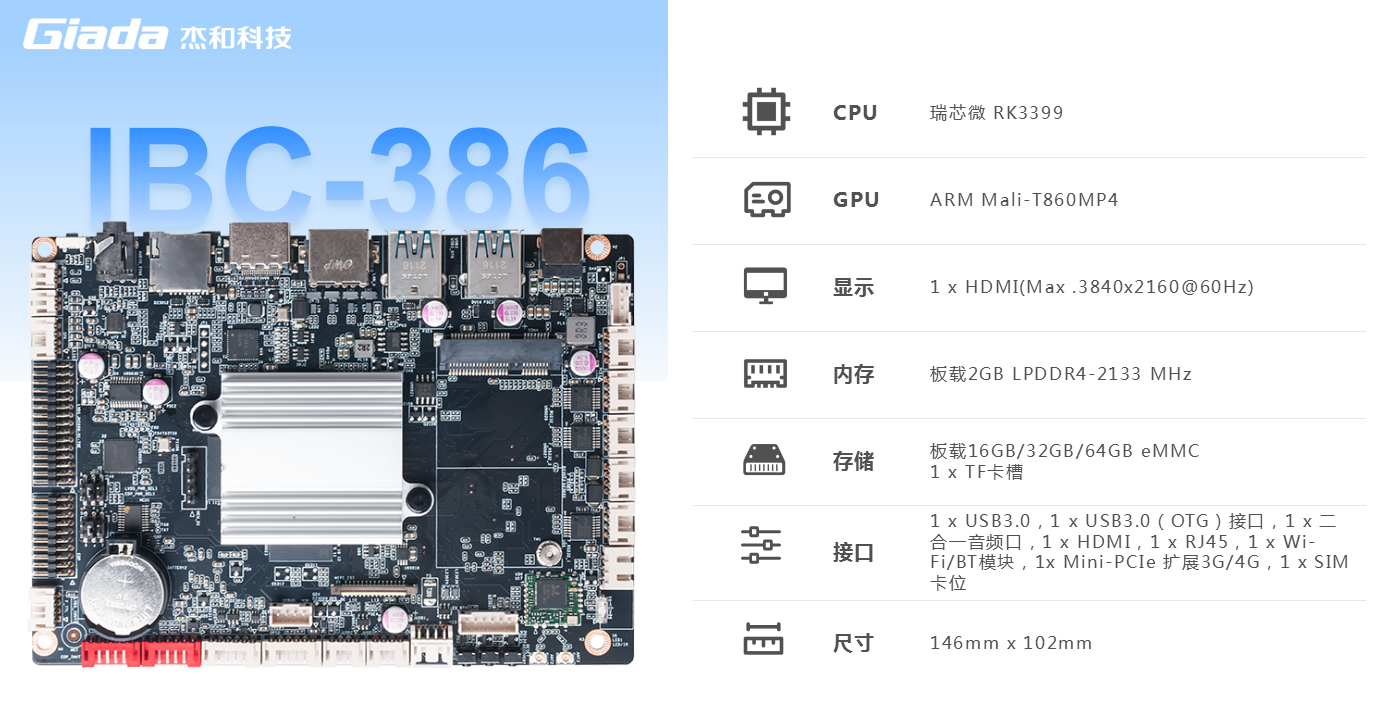 k8凯发科技IBC-386是一款基于ARM架构的3.5英寸主板,采用瑞芯微RK3399处理器(双Cortex-A72大核+四 Cortex-A53小核)六核 64 位CPU。RK3399作为瑞芯微超级扩展全能型旗舰级芯片,GPU采用四核ARM新一代高端图像处理器Mali-T860MP4,具备高性能、低功耗、强大的视觉处理能力的特点。IBC-386板载2GB LPDDR4-2133 MHz内存,板载16GB/32GB/64GB eMMC,支持1x TF卡槽,多种形式轻松扩展存储容量。